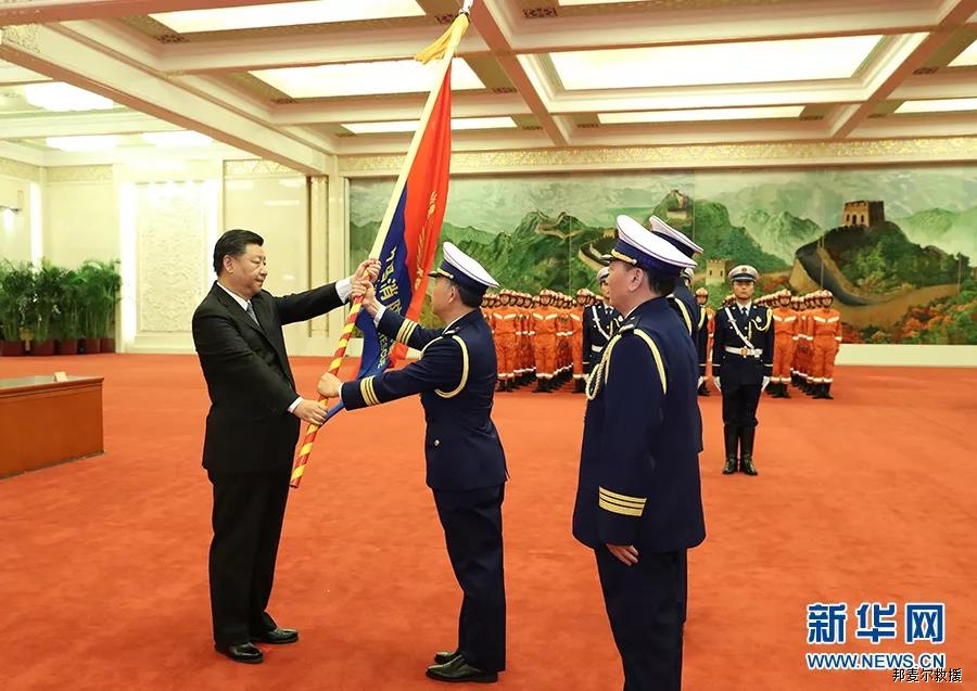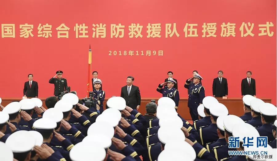 2018年11月9日,国家综合性消防救援队伍授旗仪式在人民大会堂举行。中共中央总书记、国家主席、中央军委主席习近平向国家综合性消防救援队伍授旗并致训词。
